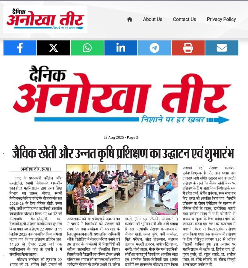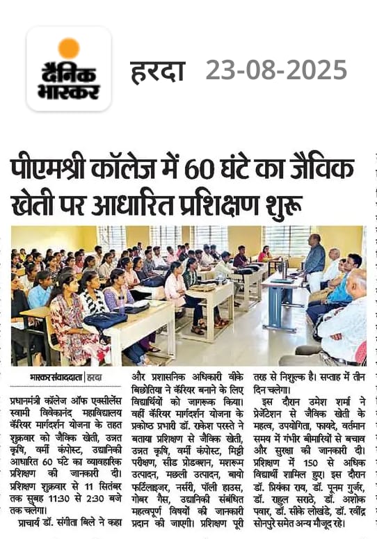 शासकीय स्वामी विवेकानंद स्नाकोत्तर महाविद्यालय हरदा में स्वामी विवेकानंद कैरियर मार्गदर्शन के अंतर्गत जैविक खेती उन्नत खेती एवं अन्य कृषि आधारित व्यवसाय हेतु रोजगारोन्मुखी प्रशिक्षण कार्यक्रम 22 अगस्त से 11 सितंबर तक किया जा रहा है । डॉ .सी.वी. रमन विश्वविद्यालय खंडवा के उमेश शर्मा द्वारा छात्रों को प्रशिक्षण दिया गया ।