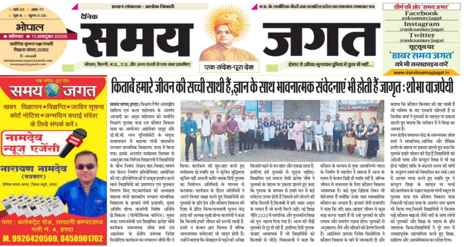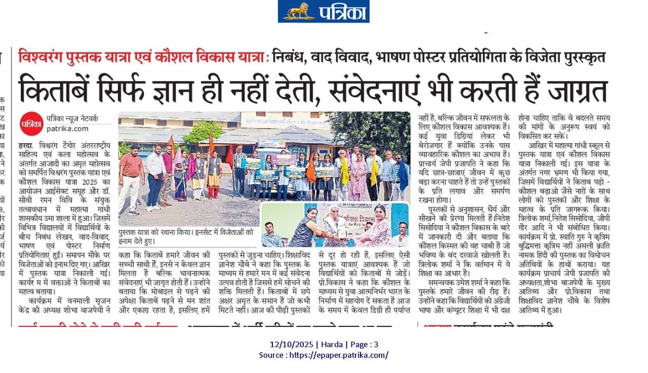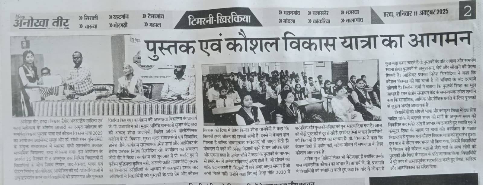 विश्व रंग टैगोर अंतरराष्ट्रीय साहित्य एवं कला महोत्सव एवं आजादी का अमृत महोत्सव के अंतर्गत विश्व रंग पुस्तक यात्रा एवं कौशल विकास यात्रा 2025 का आयोजन एआईसेक्ट समूह एवं डॉ. सी. वी. रमन यूनिवर्सिटी के संयुक्त तत्वावधान में हरदा में किया गया।