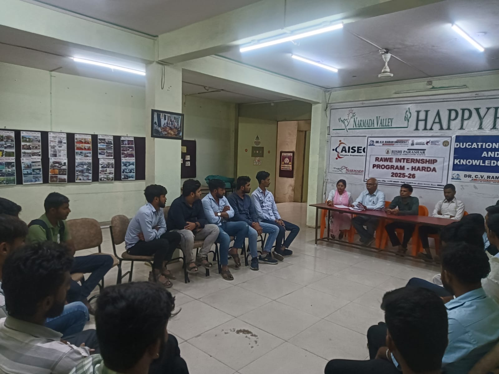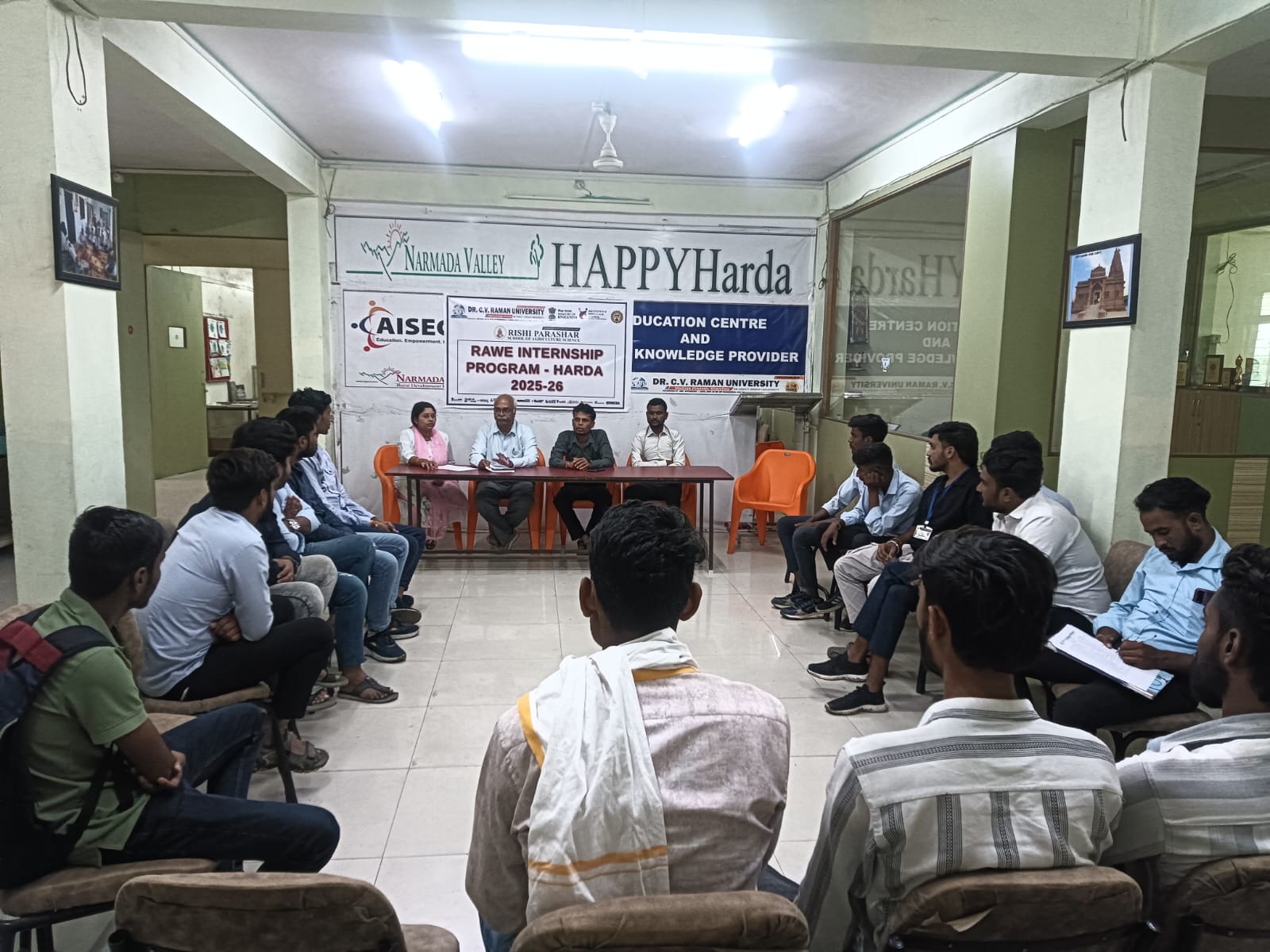 डॉ. सी. वी. रमन विश्वविद्यालय खंडवा के कृषि विभाग के चतुर्थ वर्ष के 20 विद्यार्थी RAWE (Rural Agricultural Work Experience) कार्यक्रम के अंतर्गत 6 माह की इंटर्नशिप हेतु हरदा जिले में आए l आगमन के पश्चात विद्यार्थियों की बैठक हरदा के कृषि शिक्षकों, सिविल सोसायटी प्रतिनिधियों तथा जिले के प्रगतिशील किसानों के साथ आयोजित की गई। इस बैठक में विद्यार्थियों को उनके कार्यक्षेत्र, दायित्वों एवं सर्वेक्षण पद्धति के संबंध में मार्गदर्शन प्रदान किया गया।
